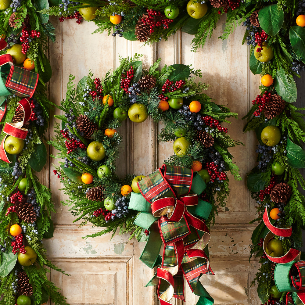 Statement wreaths with plaid bows and real-feel greenery.