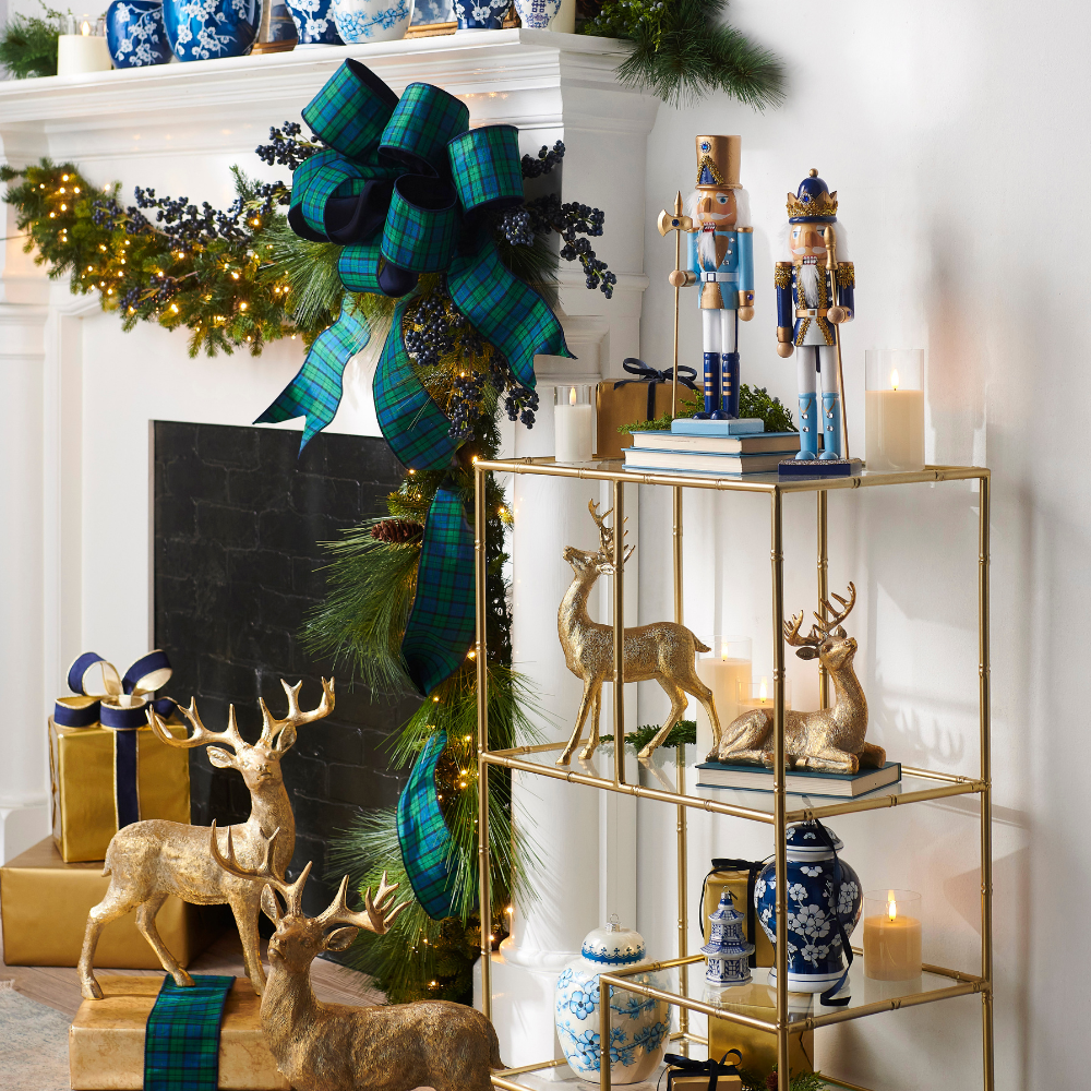 This look blends classic American heritage style with luxurious holiday textures and color palettes. Picture dark navy and hunter-green tartan ribbons, gleaming gold nutcrackers, velvet bows, and accents of red and metallic finishes. It’s equal parts rustic lodge and Park Avenue sophistication.